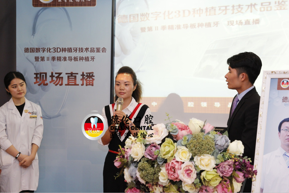 在11月14日舉行的德倫口腔“首屆3D導(dǎo)板數(shù)字化種植牙真人直播”的現(xiàn)場,一個年輕的身影的走上了舞臺,她正是德倫口腔3D導(dǎo)板數(shù)字化種植牙的受益者之一鄒女士。當(dāng)鄒女士聽聞程武醫(yī)生要進(jìn)行種植手術(shù)直播的時候,她主動提出希望可以到現(xiàn)場分享她的種植感受,用自己真實的經(jīng)歷來發(fā)聲,呼吁年輕人有任何牙齒問題都需要及早治療,不要以為能拖就脫,結(jié)果錯過治療黃金期。